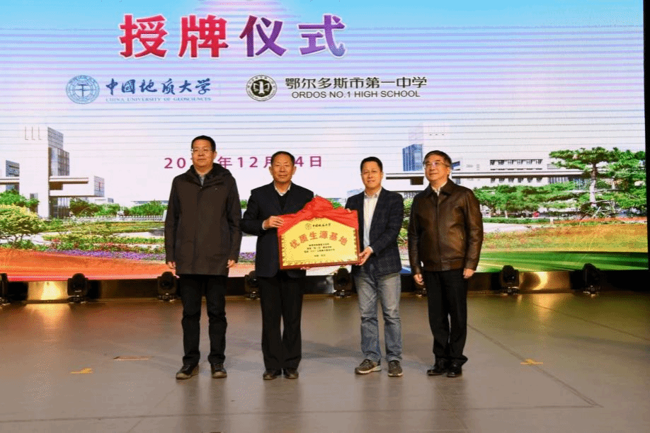 在之后举行的优质生源基地授牌仪式上,我校本科生院常务副院长周建伟教授代表学校向鄂尔多斯市第一中学授予中国地质大学(武汉)“优质生源基地”牌匾,校长白玉亮接牌。王焰新院士、万世斌局长共同见证并合影留念。