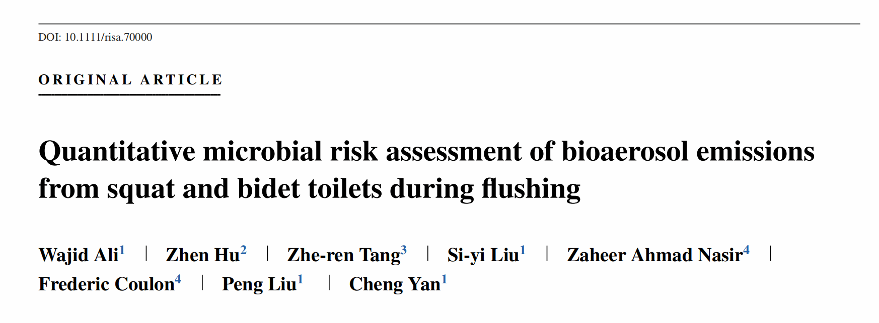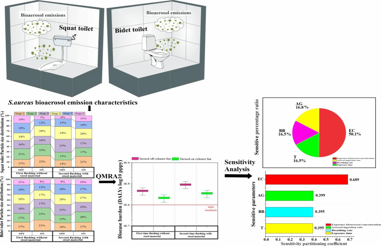 颜诚副教授的指导下于国际知名期刊《Risk Analysis》(T1,中文名:风险分析)上发表学术论文,题目为《冲厕时释放微生物气溶胶的微生物定量风险评估研究》(英文题目:《Quantitative microbial risk assessment of bioaerosol emissions from squat and bidet toilets during flushing》)。此研究不仅揭示了厕所冲水量与健康风险之间的定量关系,更为解决公共卫生、健康风险与水资源节约利用之间的平衡难题提供了新思路。