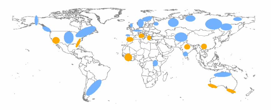 全球陆地过去一百多年降水量出现显著(p<0.05)变化区域示意图。图中标出了至少有两项研究均表明一致趋势的区域位置和范围,其中黄色表示年降水量减少,蓝色表示年降水量增加,椭圆尺寸大小表示其中或附近降水量变化方向一致的观测站(网格)数量的多少。