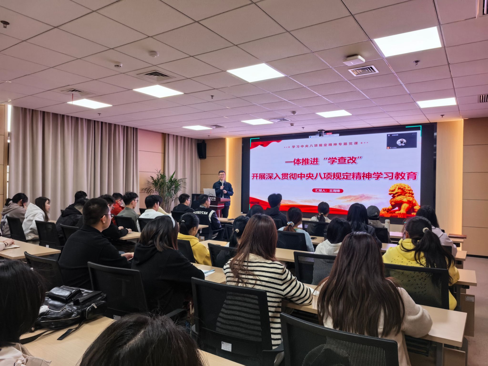 王老师讲授了一堂意义深刻的专题党课。他围绕一体推进“学查改”,开展深入贯彻中央八项规定精神学习教育。他从以学筑基、以查促改、以案为鉴、以改为本四个方面,结合实际案例,让我们充分认识到此次学习教育的重要性。在今后学习和生活中,我们要持续学习并践行中央八项规定精神,为推进中国式现代化贡献力量。