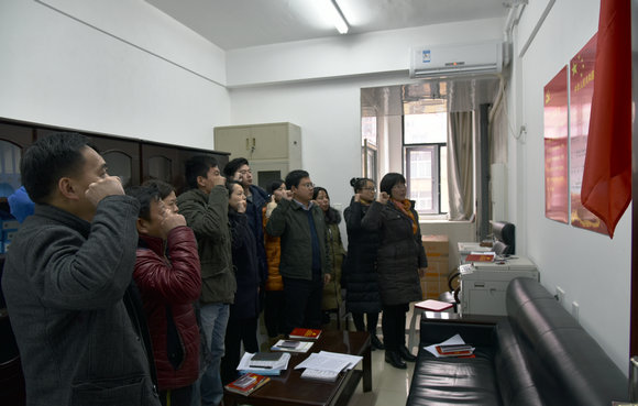 主题党日生活会上,支部成员齐唱《国歌》、重温入党誓词。
