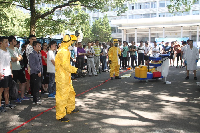 8名学生代表穿上密不透风的防护服、防毒面罩和护目镜全程参加演练。演练以实验室有机废液转运泄露事故为案例,模拟了实验员意外碰倒有机废液桶后,上报事故、现场封锁及事故危害评估、应急救援人员个人防护、消除危险源与现场恢复、事故发生后的报告、调查与评估等应急救援环节。
