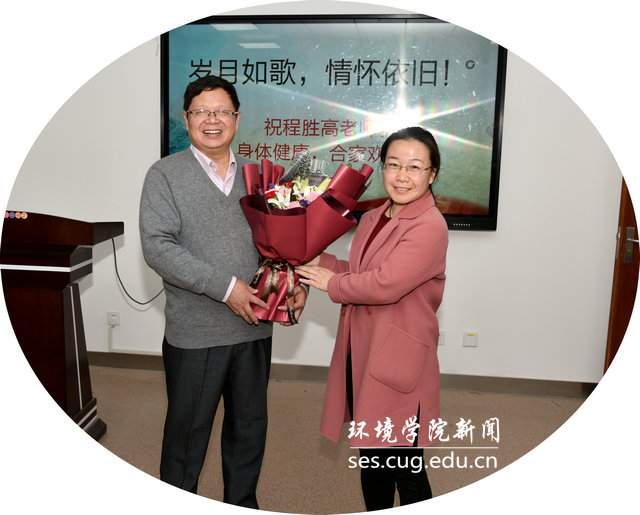 学院李素矿书记、马腾院长,柴波副院长、谢先军副院长分别代表学院党委、行政、工会等对程胜高老师自1995年来到中国地质大学(武汉)工作,二十四年为学院、为学科建设和发展所做出的贡献表示感谢,感谢他把自己的青春年华献给了环境保护事业,希望程老师人退心不退,一如既往地为学校和学院发展建言献策。