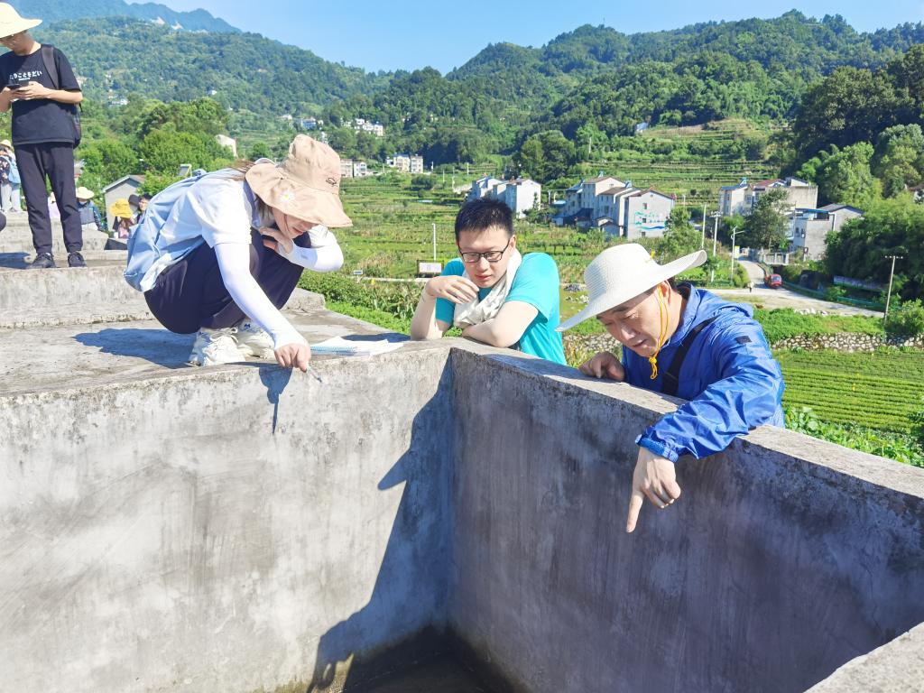 李素矿与学生一同观察张家冲水土保持站沉沙池的水位情况