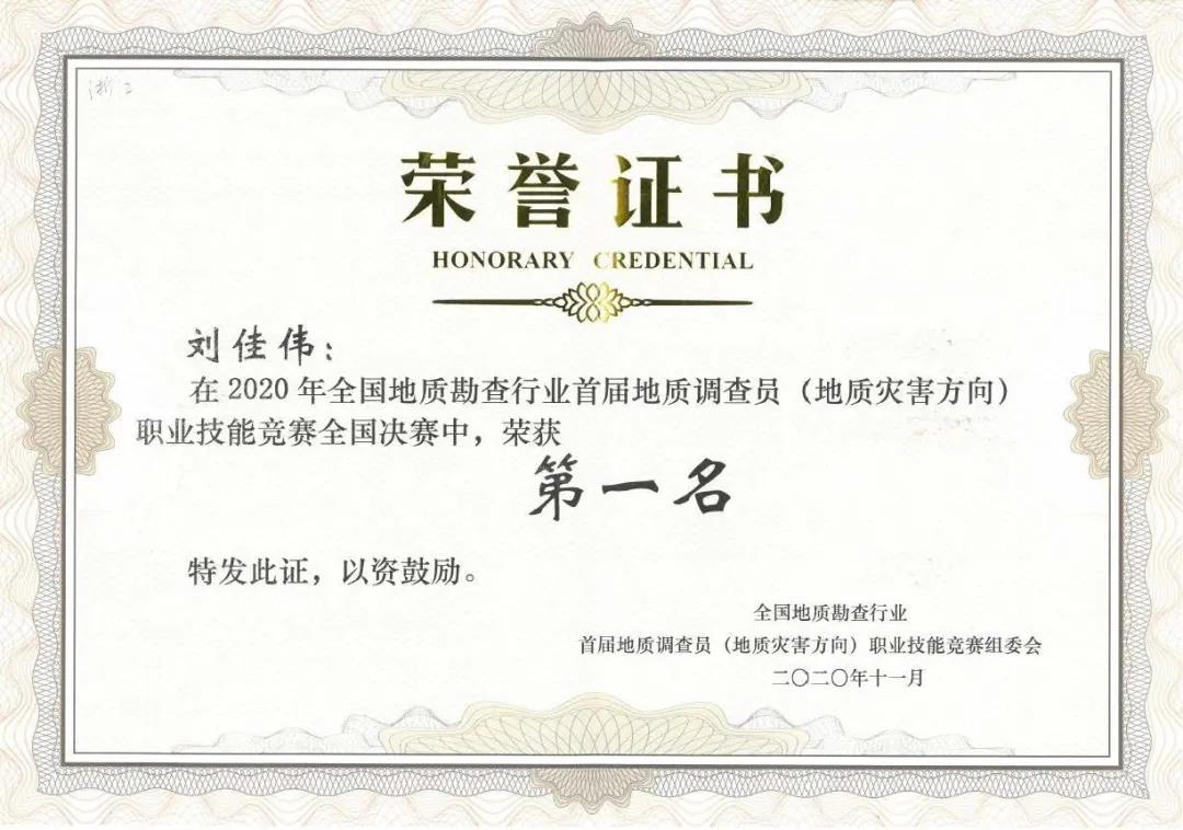 刘佳伟获全国地质勘查行业首届地质调查员(地质灾害方向)职业技能竞赛全国决赛第一名