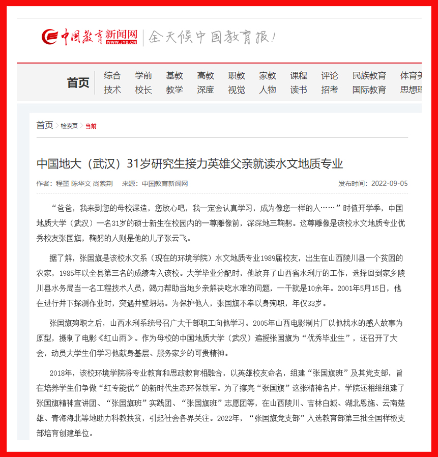 据张云飞介绍,张国旗殉职时,自己才10岁,“向张国旗学习”成为幼年的他耳边听到最多的一句话。2010年高考时,张云飞发挥失常,与父亲的母校失之交臂,被云南一所大学的地理信息系统专业录取。毕业后工作期间,看到“张国旗班”建设的系列新闻报道后,张云飞下定决心考研,继续攻读水文地质学专业研究生。2022年研究生入学考试中,他过关斩将,成功被中国地质大学(武汉)无码动漫
