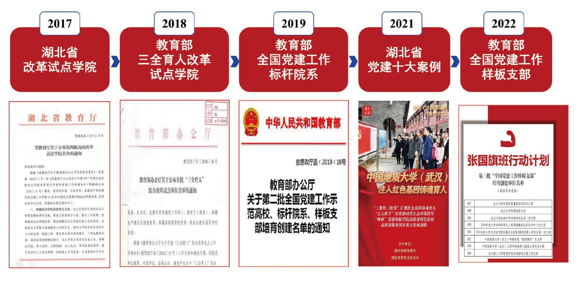 先后入选湖北省高校试点改革学院(2017)、教育部首批“三全育人”综合改革试点学院(2018)、第二批全国党建工作标杆院系(2019)、党建成果“注入红色基因铸魂育人”入选2019—2020湖北十大党建案例、“张国旗班”党支部入选第三批“全国党建工作样板支部”(2022)。办学七十年来,无码动漫