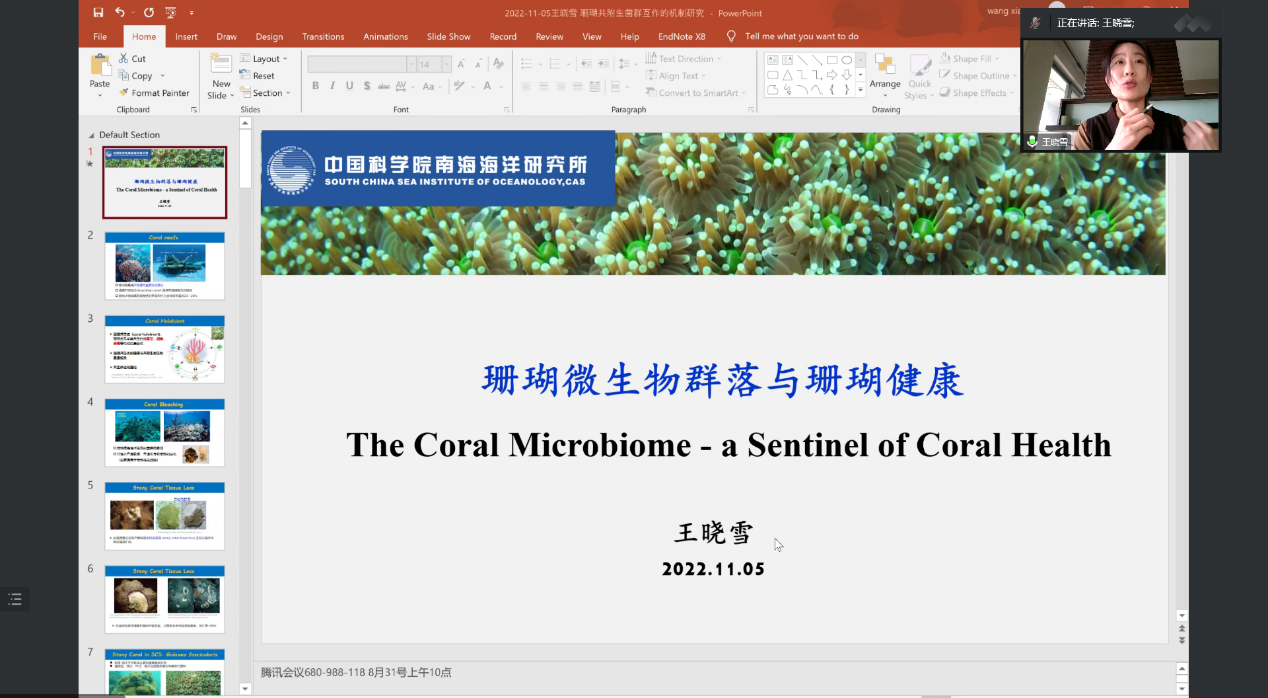 王红梅教授邀请,11月5日,中科院南海海洋研究所王晓雪研究员以《珊瑚微生物群落与珊瑚健康》为题作线上学术报告,该报告是我校校庆七十周年系列学术报告活动“名家论坛”之一,100余师生参加。王红梅教授主持报告会。