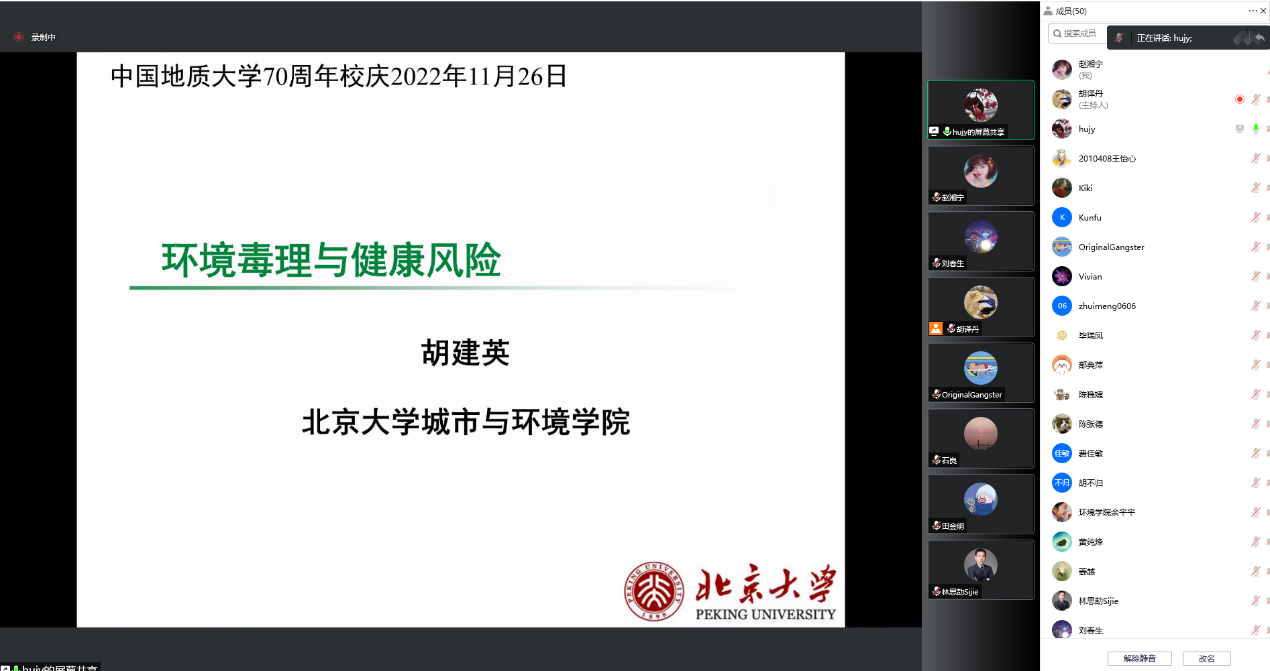 胡建英教授线上作题为《环境毒理与健康风险》的学术报告。该报告是我校校庆七十周年系列学术报告活动之一。刘春生教授主持报告会。