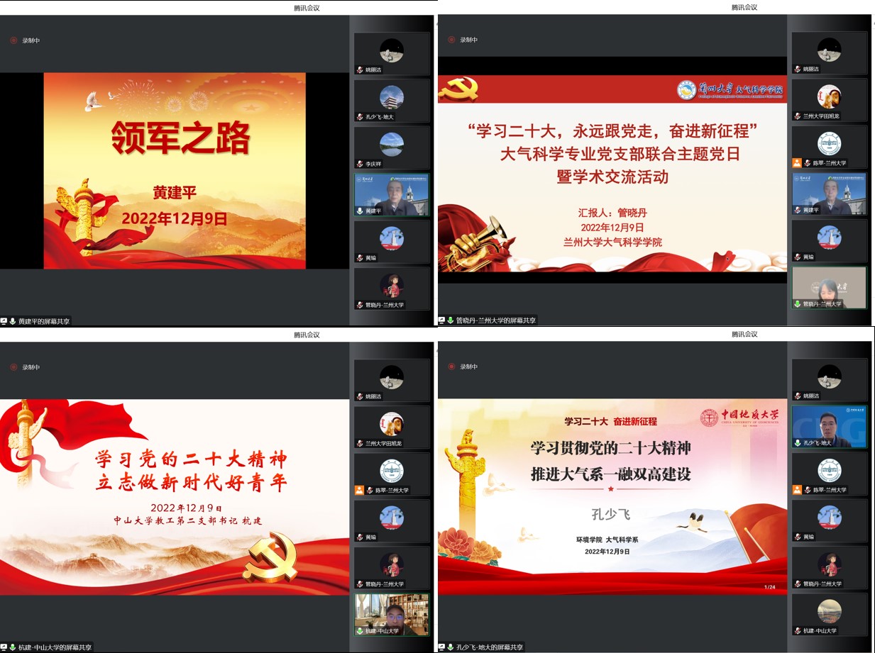 大气科学系教工党支部与兰州大学大气科学学院气候学系教工党支部、中山大学大气科学学院海洋气象(冰冻圈科学)系教工党支部联合开展“学习二十大,永远跟党走,奋进新征程”主题党日暨学术交流活动。