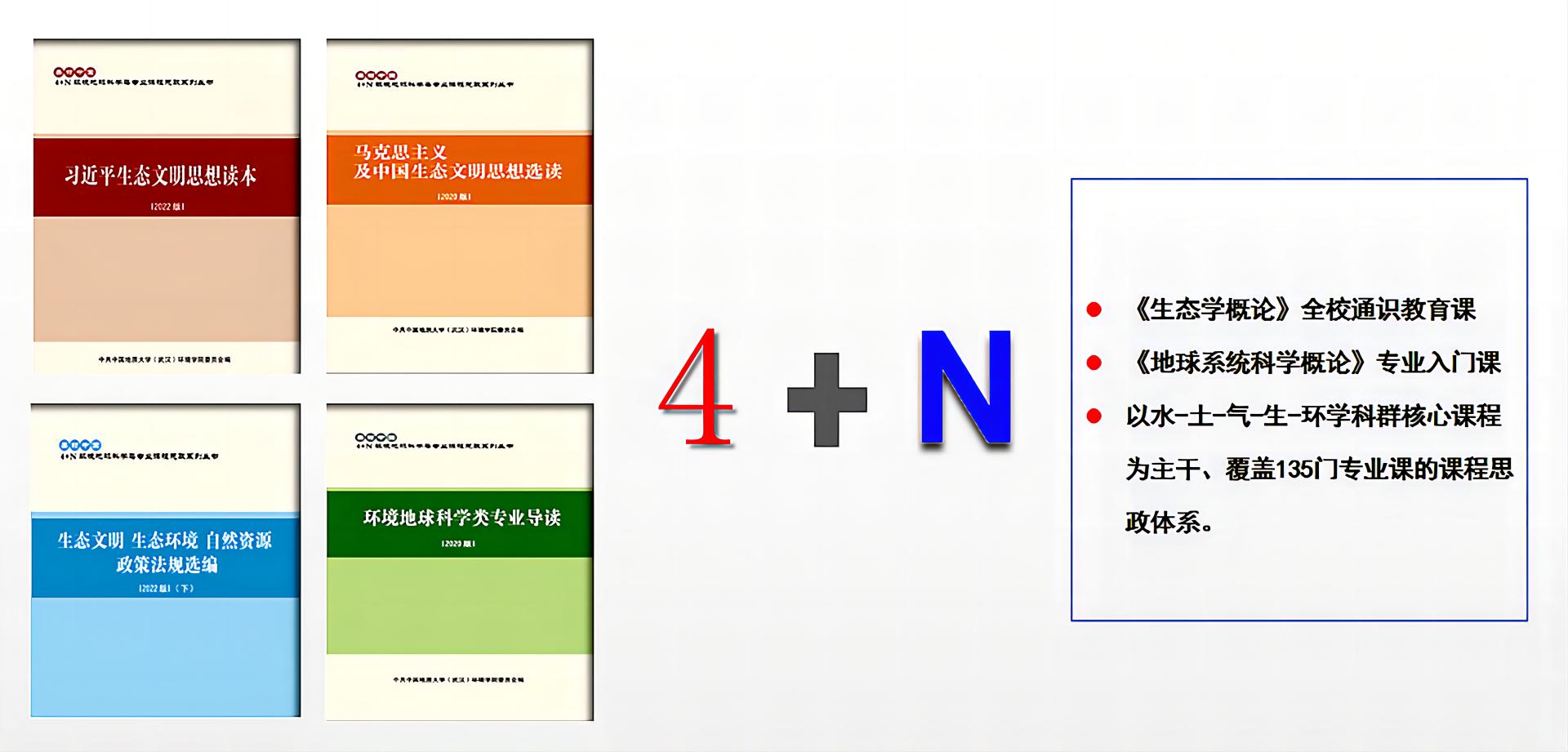 成立美丽中国课程思政研究中心,结合学科特点、专业特色和教育教学规律、人才成长成才规律,组织师生编写《习近平生态文明思想读本》《马克思主义及中国生态文明思想选读》《生态文明 生态环境 自然资源 政策法规选编》《环境地球科学类专业导读》四本课程思政教材。其中,《习近平生态文明思想读本》涵盖习近平生态文明思想的生态兴则文明兴、生态衰则文明衰的深邃历史观、人与自然和谐共生的科学自然观、绿水青山就是金山银山的绿色发展观、良好生态环境是最普惠的民生福祉的基本民生观、山水林田湖草沙是生命共同体的整体系统观、用最严格制度保护生态环境的严密法治观、全社会共同建设美丽中国的全民行动观、共谋全球生态文明建设的全球共赢观八个部分。校党委书记黄晓玫为该丛书作序。该系列教材先后修编2次在全校大学生使用,《习近平生态文明思想读本》(中英文版)在留学生中掀起学习热潮。同时在兄弟高校大学生、地大附校等中小学生中传播。
