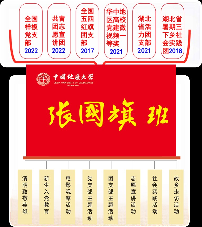 张国旗是我校1989届水文地质与工程地质专业毕业生,在一次井下探测作业时,突遇井壁坍塌,为保护他人,以身殉职。2018年,学院党委实施以英雄校友张国旗命名的“张国旗班”行动计划,校党委书记黄晓玫作序,校党委副书记、校长王焰新题词,设立了张国旗党支部、团支部,组建了社会实践团、宣讲团,围绕“三大攻坚战”、乡村振兴、长江大保护国家战略和“学习之路”系列教育奔赴全国各地开展社会实践活动,彰显典型引领效应,榜样的精神得以传承和发扬。“张国旗班”党支部入选第三批“全国党建工作样板支部”,“张国旗班”团支部获湖北省百生讲坛活力团支部金牌团支部,“张国旗班”实践团获湖北省暑期三下乡优秀团队,“红、专、能、优”的生态环保铁军基因深深植入师生的学习生活工作中。