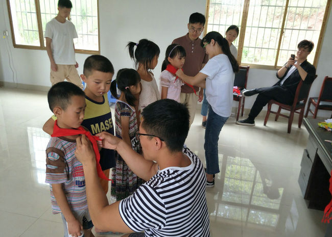 实践队员为孩子们系红领巾