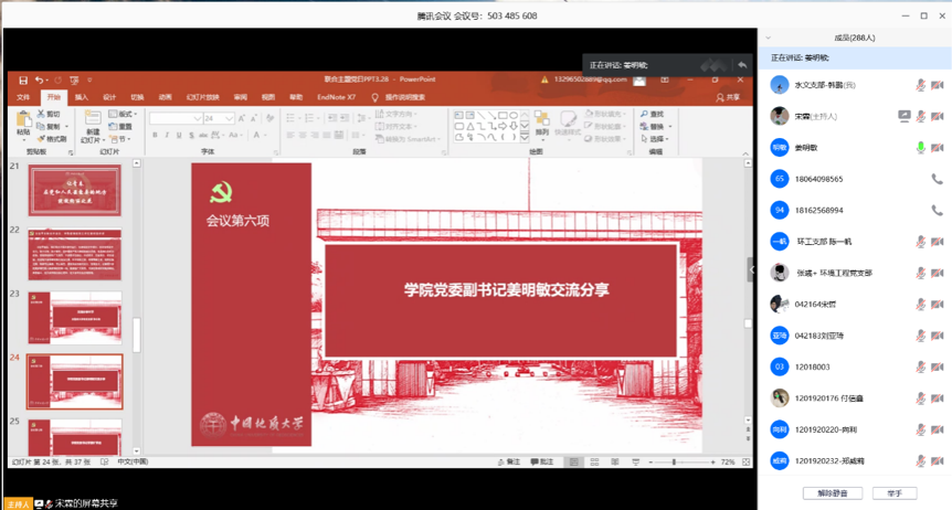 全体学生党员通过腾讯会议室以“坚持不懈 坚决打赢疫情防控阻击战”为主题召开线上联合主题党日暨争创学习型党支部交流分享会。副校长刘杰,学院党委书记李素矿、党委副书记姜明敏、学工组全体老师应邀参加会议,党建辅导员宋霖主持会议。