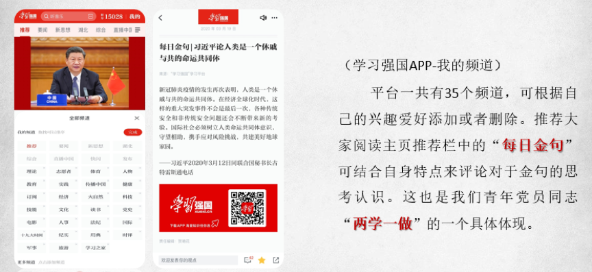每天的零散时间,我喜欢看主页推送的一些分类新闻。平台主页右上角的“三条横线”是管理“我的频道”,平台一共有35个频道,可以根据自己的兴趣添加或者删除频道。比如说我个人喜欢看理论类、志愿者类、体育类、人物类这些,大家可以看到我已经把这四类频道提到了最前面。在这里,我每天必看的一条推送就是主页推荐栏中的“每日金句”。比如,前不久推送的一条,是习总书记同联合国秘书长古特雷斯通电话时说,新冠肺炎疫情的发生再次表明,人类是一个休戚与共的命运共同体。然后我每天也都会在“每日金句”这条新闻下面做一个评论。评论的内容就是结合我自身情况,对这段话的一个思考认识。这样同时可以加深我们对总书记金句的理解掌握。遇到对我来说特别有意义、有触动的金句,我就会记录在我的学习记录本上。我想,这也是我们党员同志“两学一做”的一个具体体现。