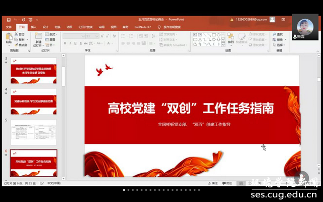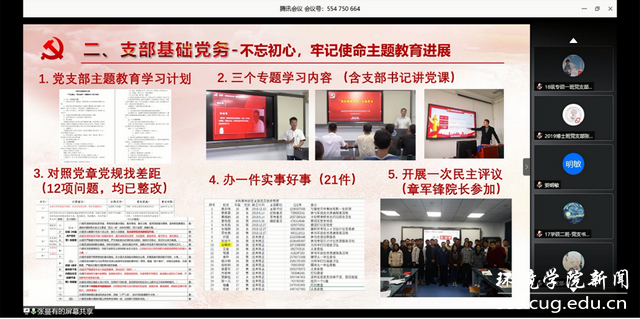 会议第一项,由地球科学学院地质学国家基地班本科生党支部张曼有分享其所在支部的建设经验。地球科学学院地质学国家基地班本科生党支部在2019年获评第二批全国党建工作样板支部。本次分享中,张曼有同志系统详细地介绍了基地班党支部的建设经验:在基础党务工作中,以“五员五导”夯实党建基础,将基础材料信息化、规范化五表一台账,扎实开展“不忘初心、牢记使命”主题教育,落实学习教育常态化,扎实开展每一项基础党务工作;在特色党建方面,以拔尖创新人才培养为中心,开展基地引航论坛、“地学之光”理论宣讲团、“又红又专地质人”社会实践,培养卓越专业技能、过硬政治素养、远大家国情怀的人才。疫情期间,将主题党日搬到线上,带领身边群众做好疫情防控工作,积极投身疫情防控志愿服务活动。张曼有同志分享结束后,参会的党员同志积极交流请教,纷纷表示要向基地班党支部学习,努力争创标杆党支部。