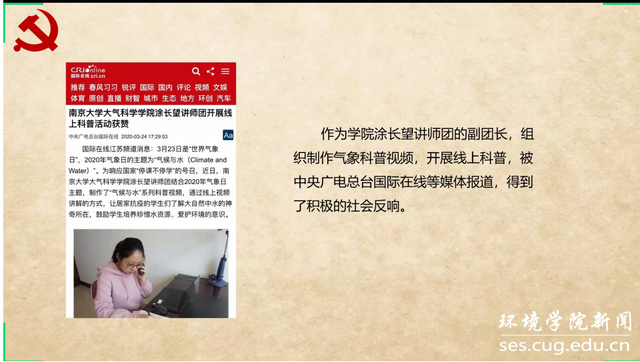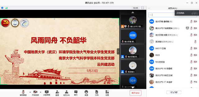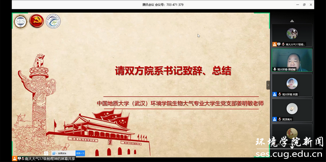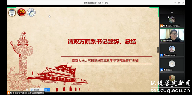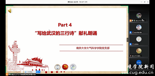 疫情防控的关心和支持,温暖的三行诗带给我们鼓劲前行的力量。这次活动既是云共建,更是心相聚,希望两个支部两个学院能够继续加强合作,交流经验,共同学习,携手并进。期待疫情结束后能够在线下进行实地调研参访,相互学习借鉴,共促发展提升。南京大学大气科学学院党委副书记喻春红表示,此次共建活动开展的非常成功,也为未来开展长期的共建交流提供了思路和借鉴。通过本次活动呈现出了两校学生昂扬向上的精神风采,值“两会”召开之际,祝福伟大祖国早日战胜疫情,繁荣昌盛,祝福江城武汉早日复苏,重振雄风,祝福地大欣欣向荣。也祝愿两个党支部的友谊之花能绽放出绚丽的色彩。