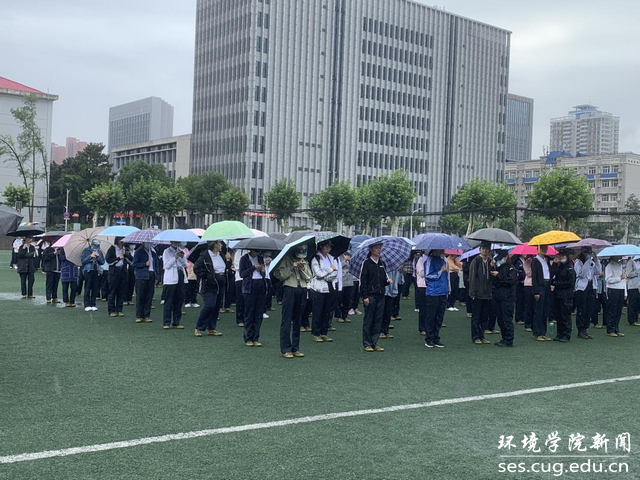 蝉鸣谢幕,梅雨季的细雨裹挟阵阵寒意,随着清晨的第一声鸟鸣划破沉寂,莅临人群尚稀疏的中国地质大学,然而就在片刻以后,这样的寂静便会被驱逐出境,取而代之的是少年的欢笑声和三两结伴的打闹声——即使是细雨侵扰,环院学子依旧没有畏缩在温暖的宿舍,而是选择了换上可以御寒的薄外套继续训练。站在运动场旁本是可以看见一顶顶蓝色迷彩的帽子整齐划一,而此刻被色彩斑斓的伞替代,少了些统一的美,却因为坚持精神的点缀而不失该有的和谐。主席台上掷地有声的致辞与落下的雨滴一起在深深浅浅的水洼中炸开泥土的缄默,为阴沉的天幕渲染出浓墨重彩。
