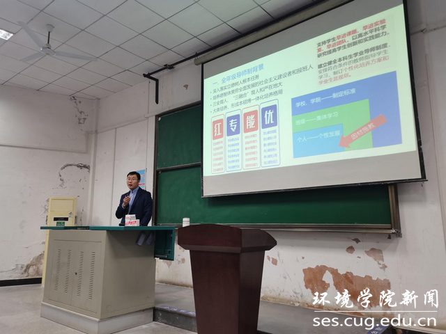 的学科和专业优势,主动融入研究型学院发展大局,成为德智体美劳全面发展的社会主义建设者和接班人。三是结合自身成长经历,引导同学们主动适应大学的学习生活,珍惜时光、主动作为,实现“内驱型成长”。四是通过引用地大校友温家宝2012年回母校的讲话,鼓励大家发扬艰苦朴素、求真务实的校训精神,沉淀积累、厚积薄发,培养艰苦奋斗的素质和独立思考的能力。五是引用《习近平的七年知青岁月》和《温家宝地质笔记》两本书的内容,引导同学们要立大志、明大德、成大才、担大任,努力成为堪当民族复兴重任的时代新人。