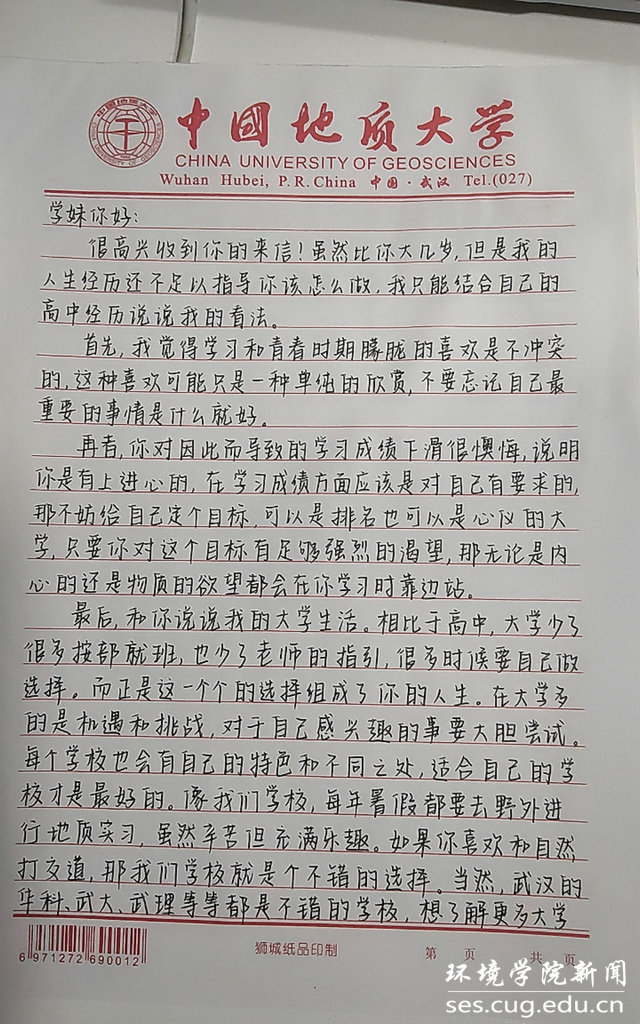 水文专业大学生党支部入党积极分子尤嘉琪:这次活动让我们和云南的同学之间产生了联系,从字里行间感受他们每个人的喜怒哀乐,似乎能看见一个人坐在教室里一笔一划写下每一个字的场景,在给他们回信答疑解惑的过程当中,也让我再度回忆起了美好的高中生活,他们的疑虑都是我曾拥有的,因此便格外感同身受,想要将心中的想法都用笔进行表达,在这个过程中也有了一些新的体会和感悟,这都是弥足珍贵的,也希望我的建议能真正帮助到他们,让他们的高中生活更加顺利吧。