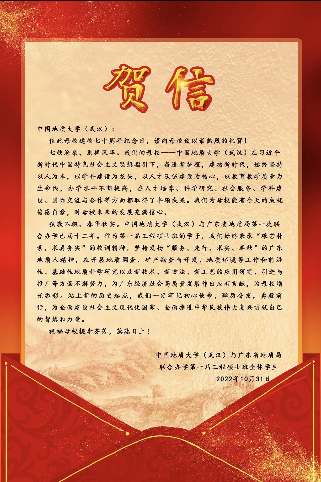 近日,中国地质大学与广东省地质局联合办学第一届工程硕士班全体学生向母校发来七十周年校庆贺信。