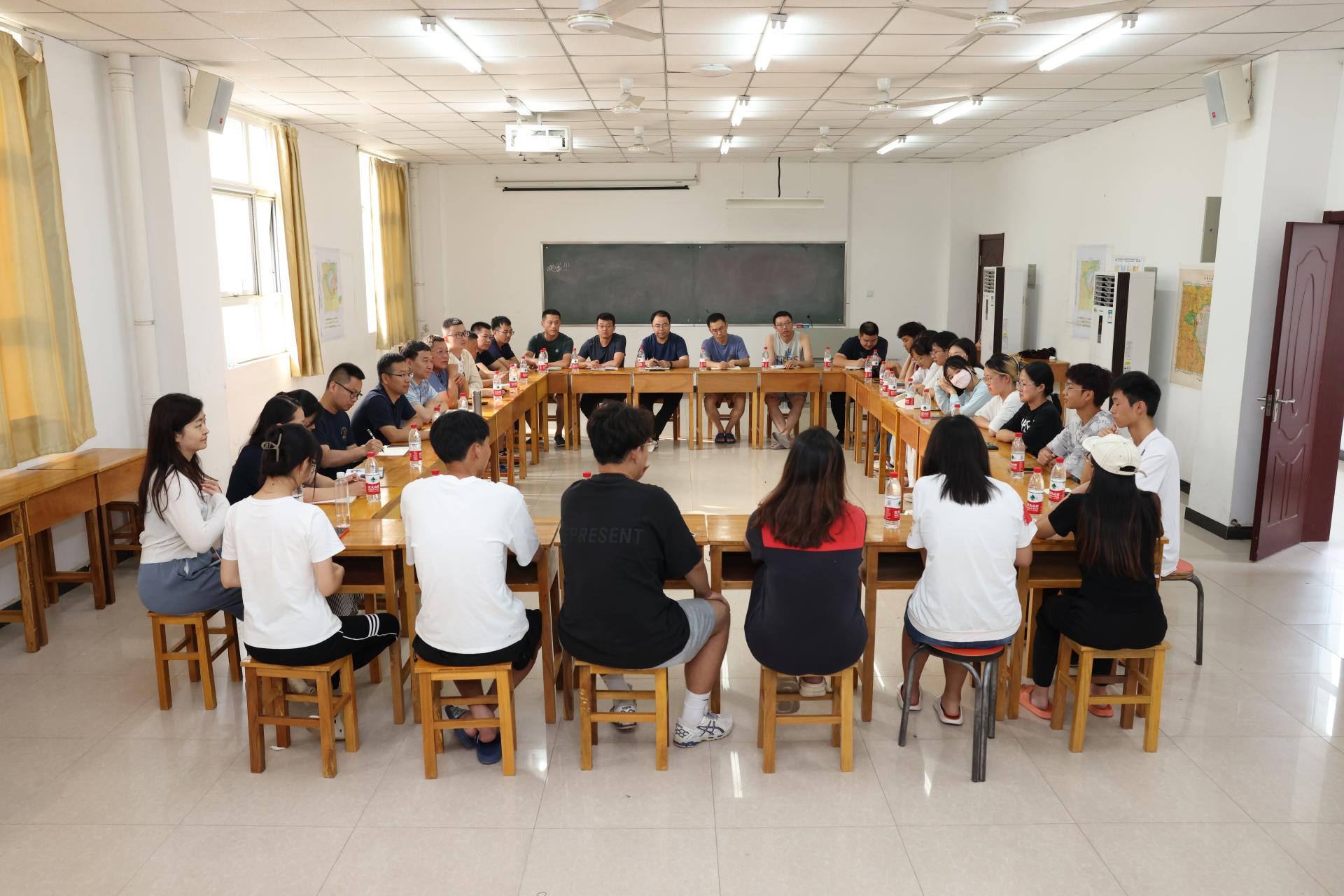 通讯员陈俊男  摄影张祖浩  编辑耿婧)8月10日下午,周口店教学实习基地召开师生座谈会。学院党委书记李素矿、院长史建波、党委副书记王海锋,学院办公室主任刘凤莲一行参加周口店实习基地师生座谈会,全体实习带队老师、辅导员以及学生代表40余人参加活动。陈俊男主持座谈会。