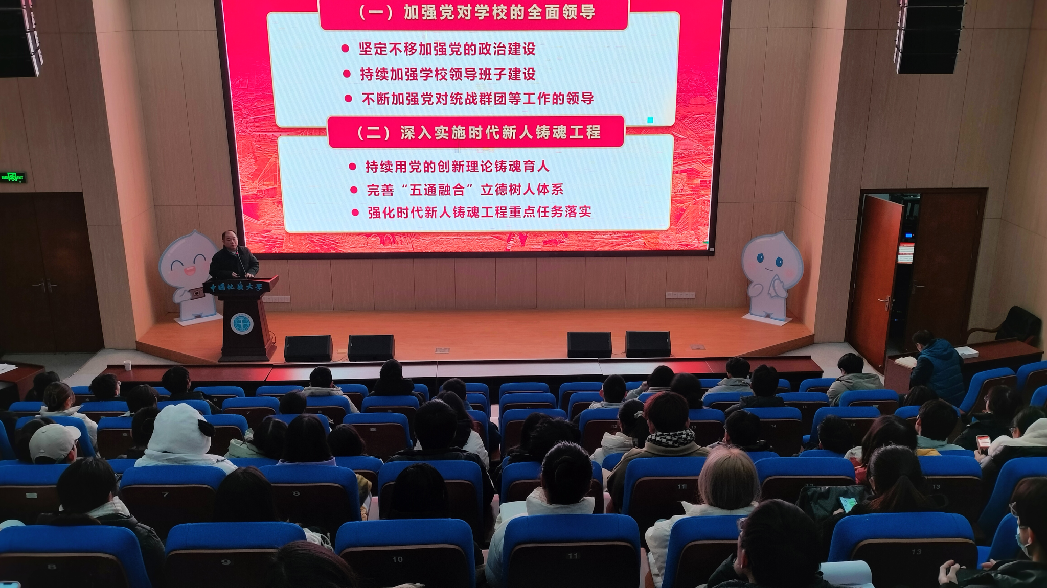 姜明敏带领大家回顾学校第十三次党代会基本情况,学习学校第十三次党代会报告精神。他重点向大家介绍了学校第十三次党代会报告中“克难进取,五年来学校事业获得新发展;砥砺前行,勇担新时代新征程光荣使命;踔厉奋发,开创研究型大学建设新局面;勠力同心,全面加强党的领导和党的建设”四个部分重要内容。他要求大家要深入领会学校第十三次党代会报告精神,学习了解“六个始终坚持”“四大使命”“七项行动”等丰富内涵,积极参与“更高水平开放、更深层次改革、更高质量创新”,将学校第十三次党代会精神和决策部署转化为个人学习成长的强大动力。