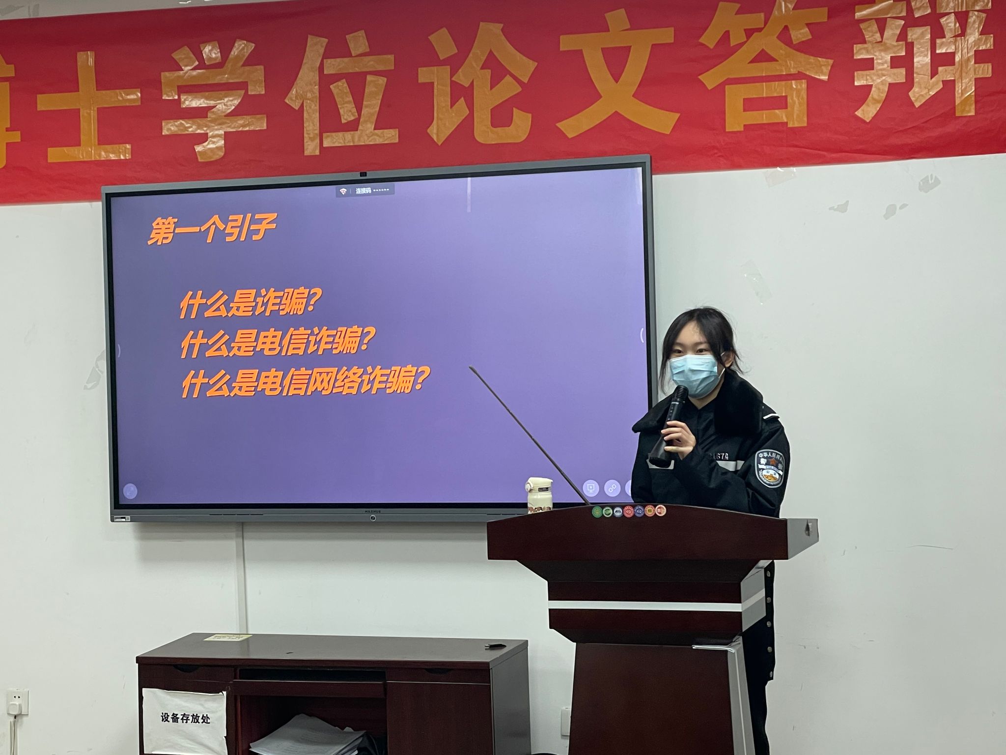 董佩珏警官主讲《终结诈骗》安全知识讲座。她介绍近期电诈警情形势及受害者分布情况,援引真实案例,详细剖析网络刷单、网上贷款、冒充网购客服、冒充熟人、冒充公检法、网聊骗局等常见诈骗手法,就如何防范电信诈骗、如何保护好个人身份信息、遭遇电信诈骗后的补救措施等方面传授防诈骗知识。