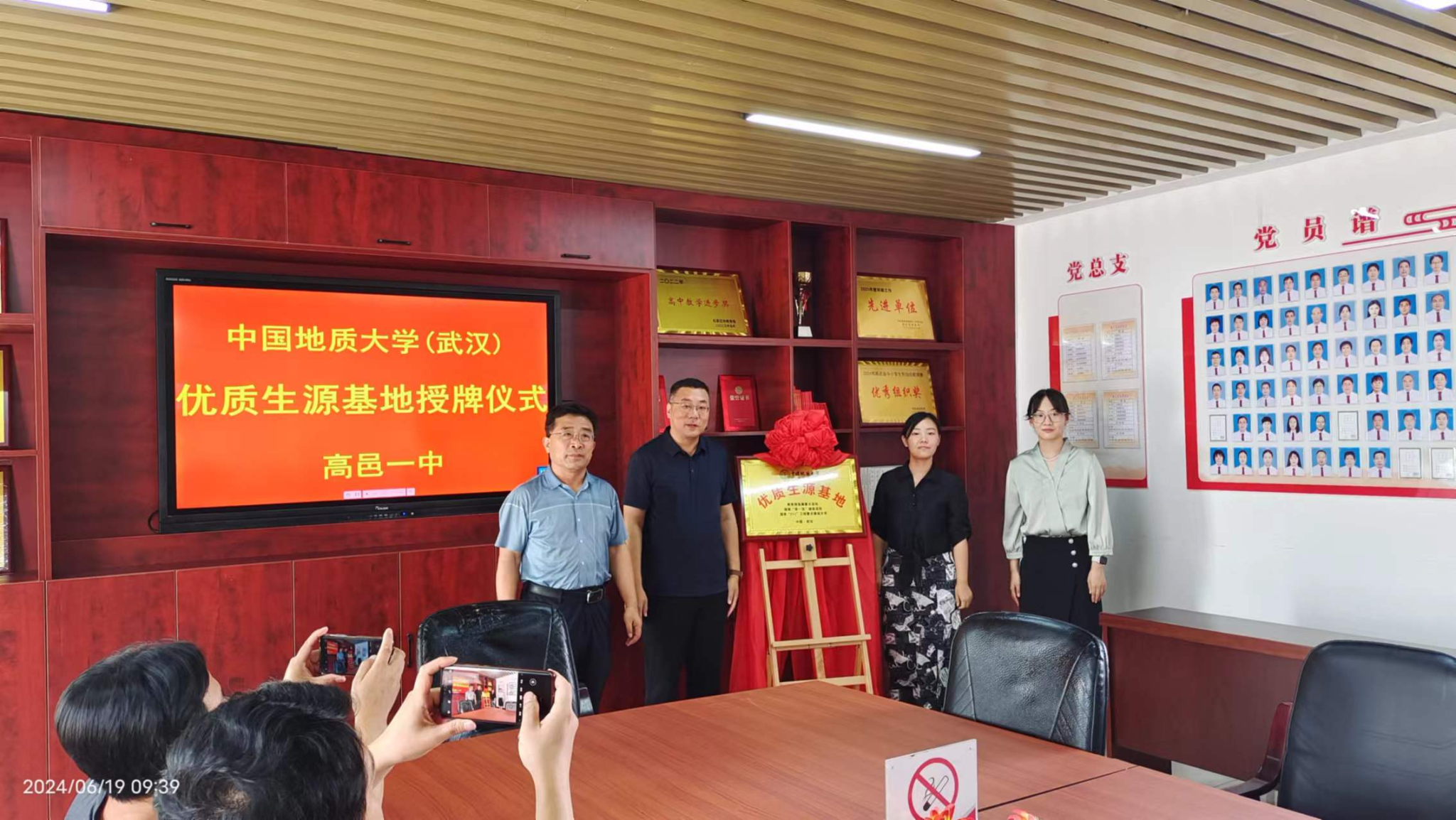 中国地质大学(武汉)水资源与水文地质系副教授李静、辅导员宋霖与高邑县教育局党组书记郭若章、高邑县第一中学党总支书记王新军共同为“优质生源基地”揭牌。