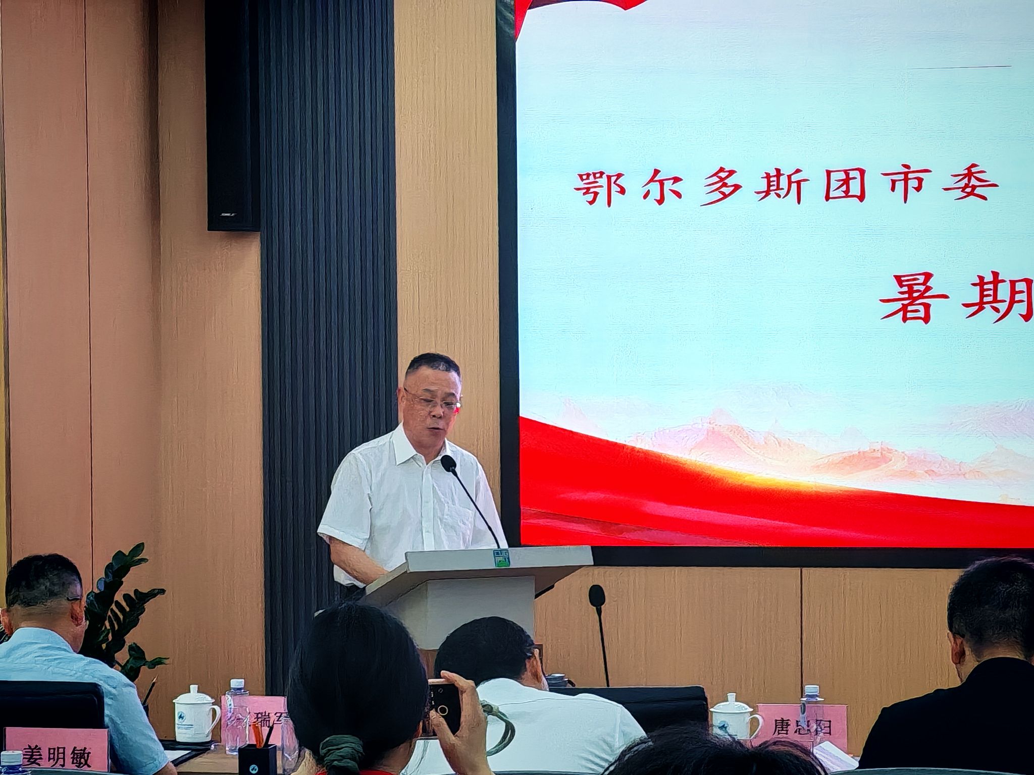 鄂尔多斯团市委书记王颖超讲话。她对两校师生来鄂尔多斯开展大学生社会实践表示欢迎,并介绍团市委组织开展大学生社会实践、社会实习和挂职基层团组织书记等专项工作实施情况。她向两校大学生再次发出实习实践邀请,希望与两校开展紧密合作,吸引更多学子扎根鄂尔多斯。