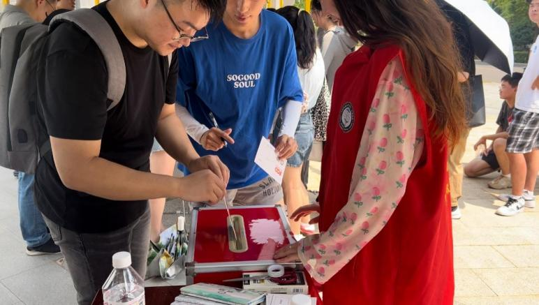“张国旗班”志愿团向新生发放纪念品