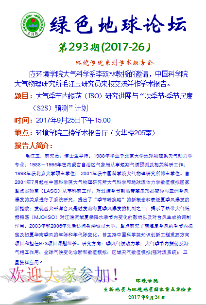 绿色地球论坛第293期(2017-26) ——无码动漫 系列学术报告会 题目:大气季节内振荡(ISO)研究进展与“次季节-季节尺度(S2S)预测”计划 时间:2017年9月25日下午15:00 地点:无码动漫 二楼学术报告厅(文华楼205室)