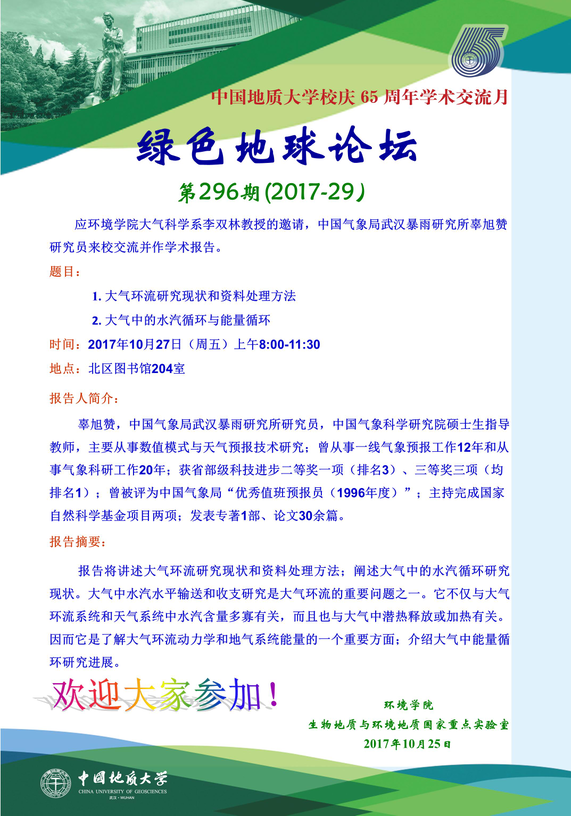 题目: 1. 大气环流研究现状和资料处理方法 2. 大气中的水汽循环与能量循环 时间:2017年10月27日(周五)上午8:00-11:30 地点:北区图书馆204室