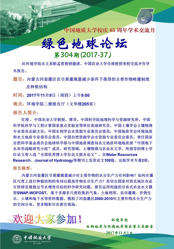 绿色地球论坛第304期(2017-37) ——无码动漫 系列学术报告会 题目:内蒙古河套灌区在引黄灌溉量减少条件下推荐的主要作物畦灌制度及种植结构 时间:2017年11月9日(周四)上午9:00 地点:无码动漫 二楼报告厅(文华楼205室)