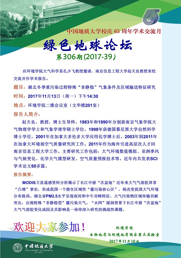 绿色地球论坛第306期(2017-39) ——无码动漫 系列学术报告会 题目:湖北冬季重污染过程特殊“非静稳”气象条件及区域输送特征研究 时间:2017年11月13日(周一)下午14:30 地点:无码动漫 二楼会议室(文华楼201室)