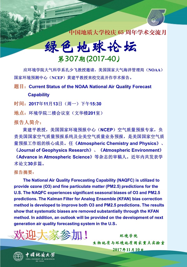 绿色地球论坛第307期(2017-40) ——无码动漫 系列学术报告会 题目:Current Status of the NOAA National Air Quality Forecast Capability 时间:2017年11月13日(周一)下午15:30 地点:无码动漫 二楼会议室(文华楼201室)