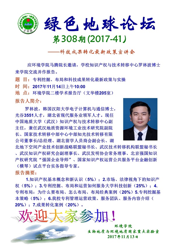 绿色地球论坛第308期(2017-41) ——无码动漫 系列学术报告会 题目:专利挖掘、布局和科技成果转化最新政策与实操 时间:2017年11月14日(周二)上午10:00 地点:无码动漫 二楼学术报告厅(文华楼205室)
