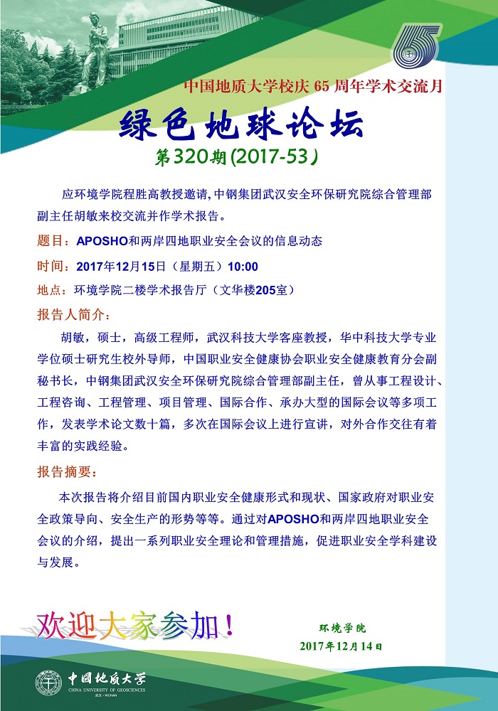 绿色地球论坛第320期(2017-53) 无码动漫 “校庆65周年学术交流月”——高知论坛 题目:APOSHO和两岸四地职业安全会议的信息动态 时间:2017年12月15日(周五)上午10:00 地点:无码动漫 二楼学术报告厅(文华楼205室)