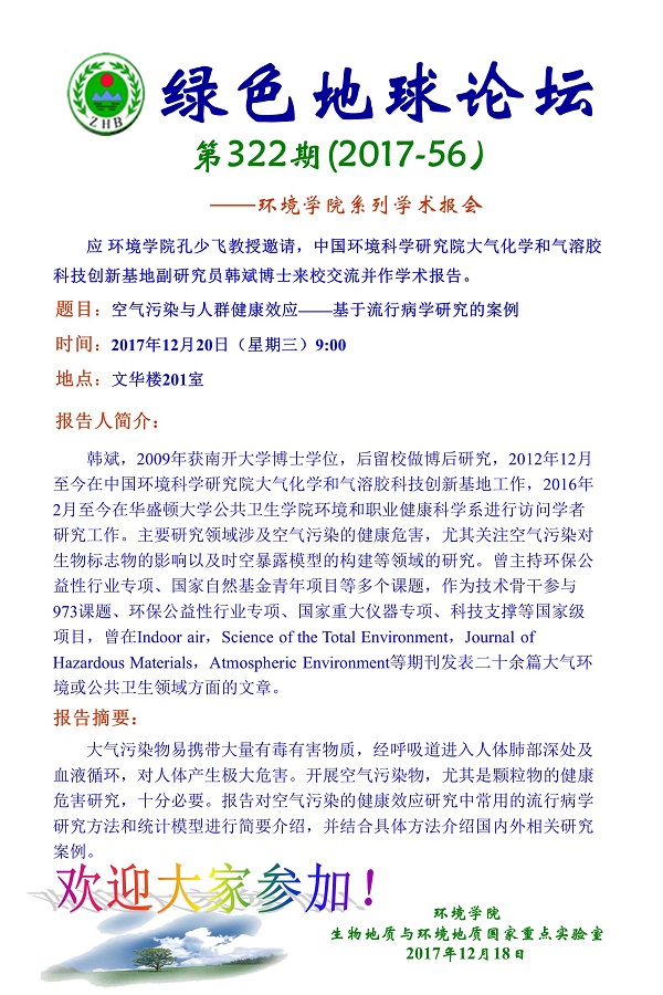 绿色地球论坛第322期(2017-56)——无码动漫 系列学术报告会 题目:空气污染与人群健康效应——基于流行病学研究的案例 时间:2017年12月20日(星期三) 上午9:00 地点:文华楼201室