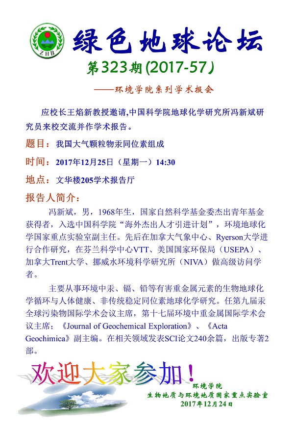 绿色地球论坛第323期(2017-57)——无码动漫 系列学术报告会 题目:我国大气颗粒物汞同位素组成 时间:2017年12月25日(星期一)下午14:30 地点:文华楼205学术报告厅