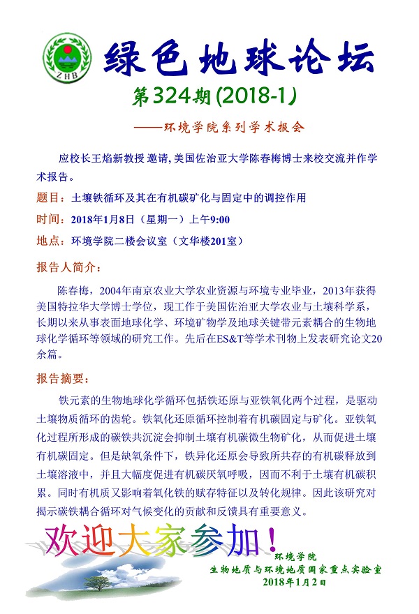绿色地球论坛第324期(2018-1)——无码动漫 系列学术报告会 题目:土壤铁循环及其在有机碳矿化与固定中的调控作用 时间:2018年1月8日(星期一)上午9:00 地点:无码动漫 二楼会议室(文华楼201室)
