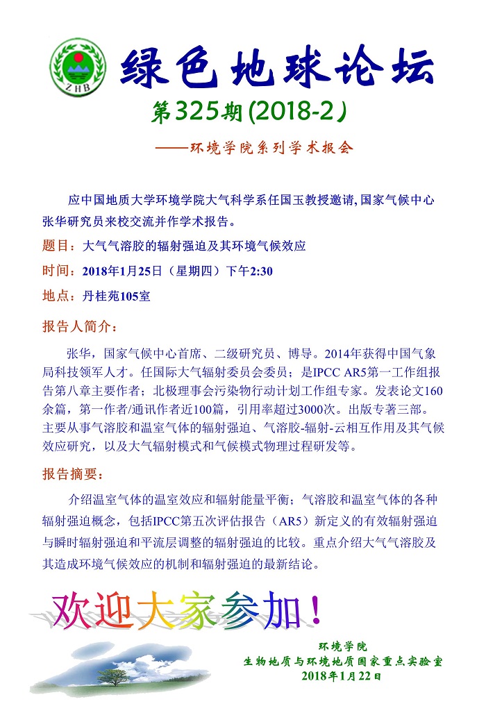 绿色地球论坛第325期(2018-2)——无码动漫 系列学术报告会 题目:大气气溶胶的辐射强迫及其环境气候效应 时间:2018年1月25日(星期四)下午2:30 地点:丹桂苑105室
