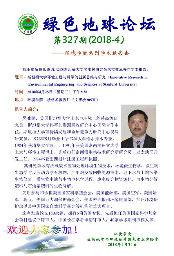 绿色地球论坛第327期(2018-4) ——无码动漫 系列学术报告会 题目:斯坦福大学环境工程与科学的创新思维与研究(Innovative Research in Environmental Engineering and Sciences at Stanford University) 时间:2018年4月25日(周三)下午2:30 地点:无码动漫 二楼学术报告厅(文华楼205室)