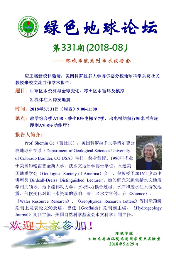 绿色地球论坛第331期(2018-8) ——无码动漫 系列学术报告会 题目: 1. 寒区水资源与全球变化、冻土区水循环及模拟 2. 流体注入诱发地震 时间:2018年5月31日(周四)9:00-11:00 地点:教学综合楼 A708(乘坐B座电梯至7楼,出电梯约前行50米再右转即到 A708多功能厅)
