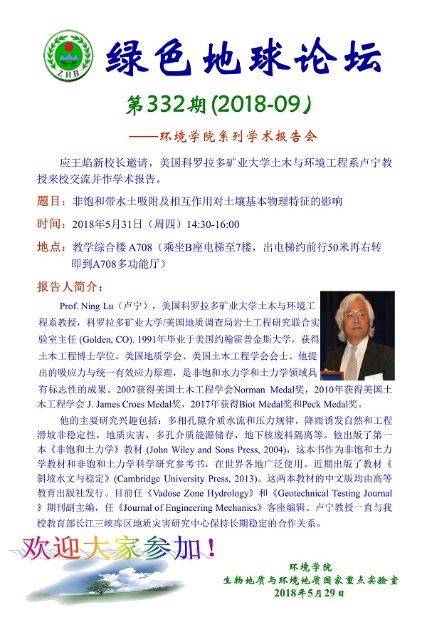 绿色地球论坛第332期(2018-9) ——无码动漫 系列学术报告会 题目:非饱和带水土吸附及相互作用对土壤基本物理特征的影响 时间:2018年5月31日(周四)14:30-16:00 地点:教学综合楼 A708(乘坐B座电梯至7楼,出电梯约前行50米再右转即到 A708多功能厅)