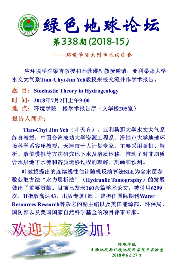 绿色地球论坛第338期(2018-15) ——无码动漫 系列学术报告会 题目:Stochastic Theory in Hydrogeology 时间:2018年7月2日上午9:00 地点:无码动漫 二楼学术报告厅(文华楼205室)