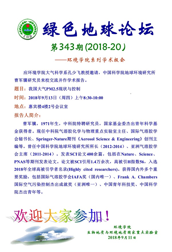 绿色地球论坛第343期(2018-20) ——无码动漫 系列学术报告会 题目:我国大气PM2.5现状与控制 时间:2018年9月13日(周四)上午8:30-10:00 地点:惠宾楼4楼2号会议室