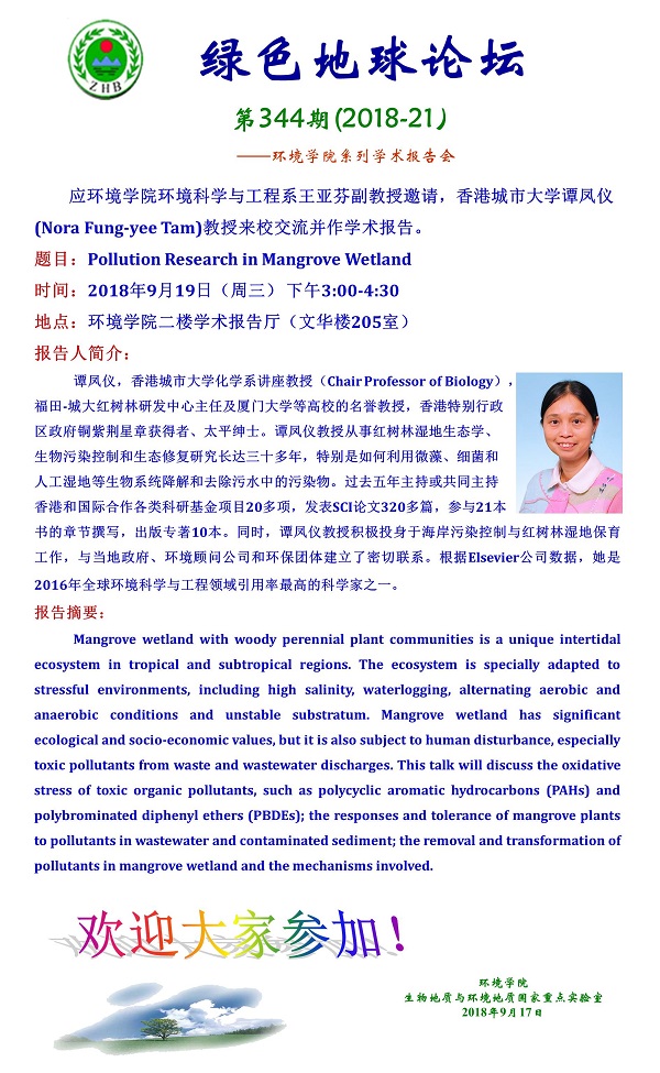 绿色地球论坛第344期(2018-21) ——无码动漫 系列学术报告会 题目:Pollution Research in Mangrove Wetland 时间:2018年9月19日(周三)下午3:00-4:30 地点:无码动漫 二楼学术报告厅(文华楼205室)