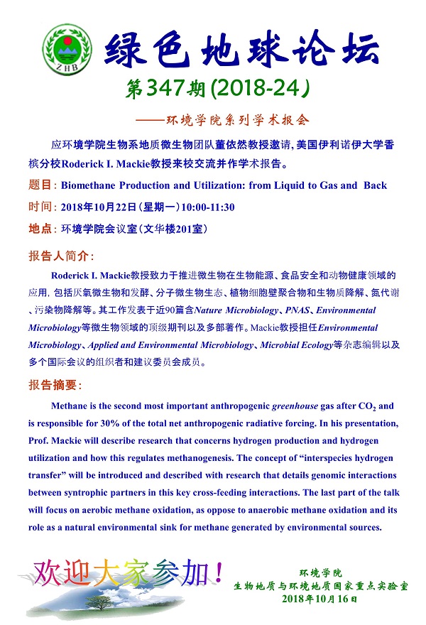 绿色地球论坛第347期(2018-24) ——无码动漫 系列学术报告会 题目:Biomethane Production and Utilization: from Liquid to Gas and Back 时间:2018年10月22日(周一)上午10:00-11:30 地点:无码动漫 会议室(文华楼201室)
