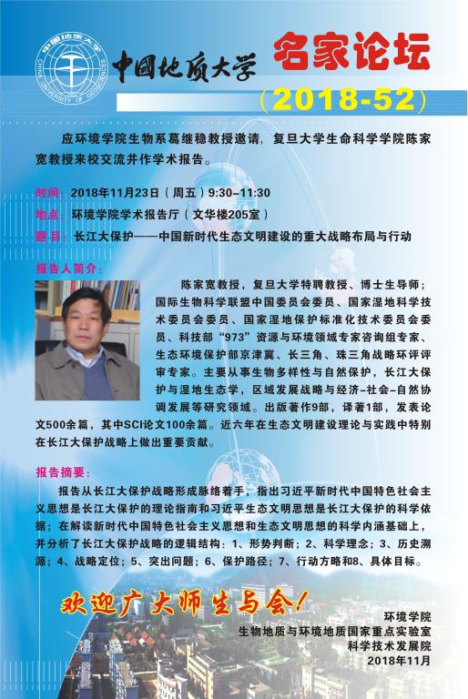 名家论坛(2018-52) 题目:长江大保护——中国新时代生态文明建设的重大战略布局与行动 时间:2018年11月23日(周五)9:30—11:30 地点:无码动漫 学术报告厅(文华楼205室)
